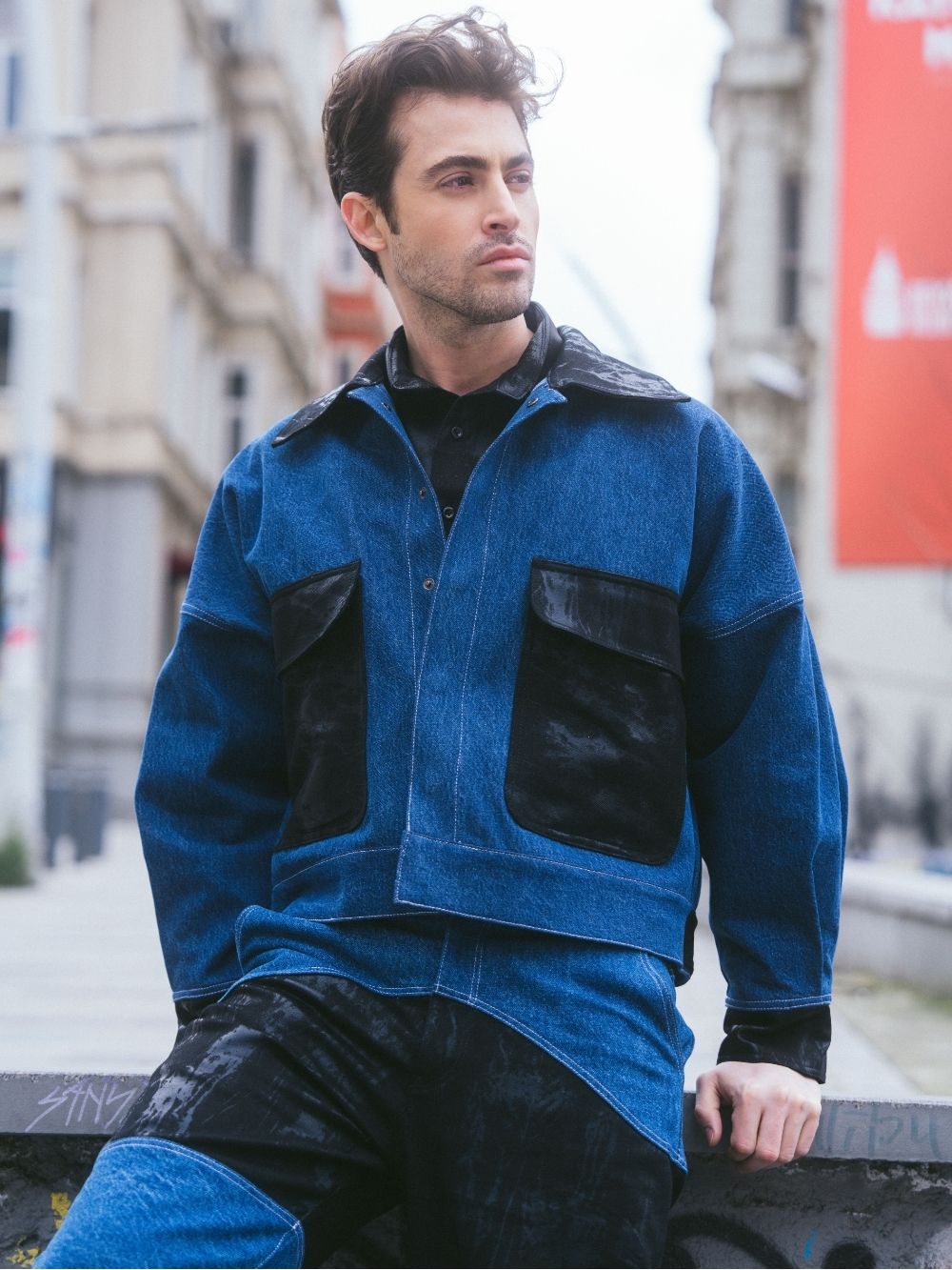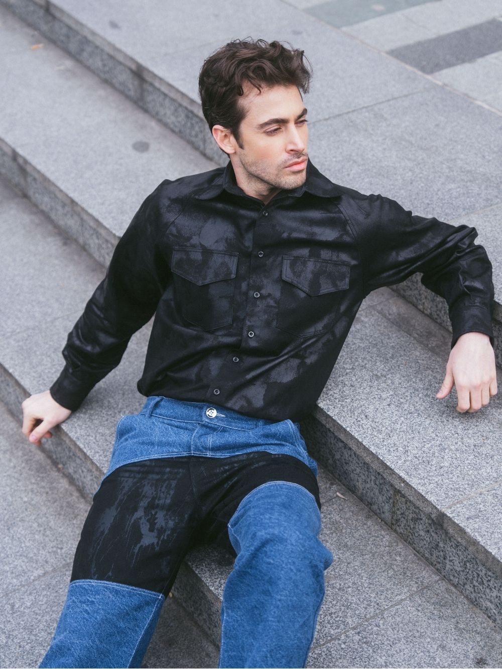 Crafted from black camouflage-coated fabric, this shirt features raglan sleeves for a relaxed fit. Two front pockets add functionality to its bold, urban design.