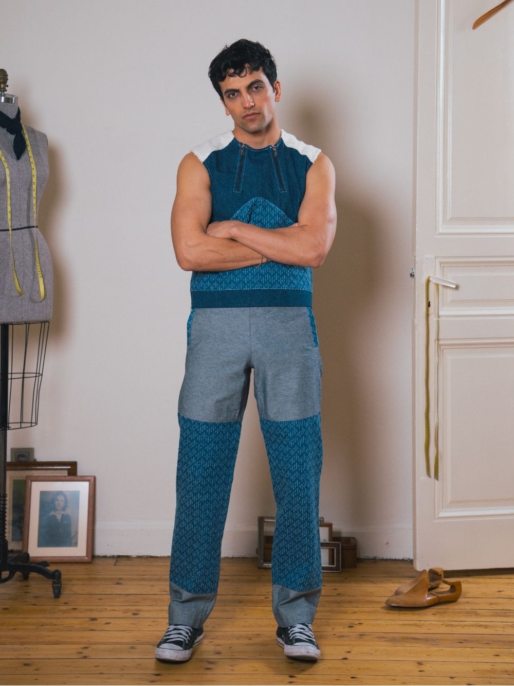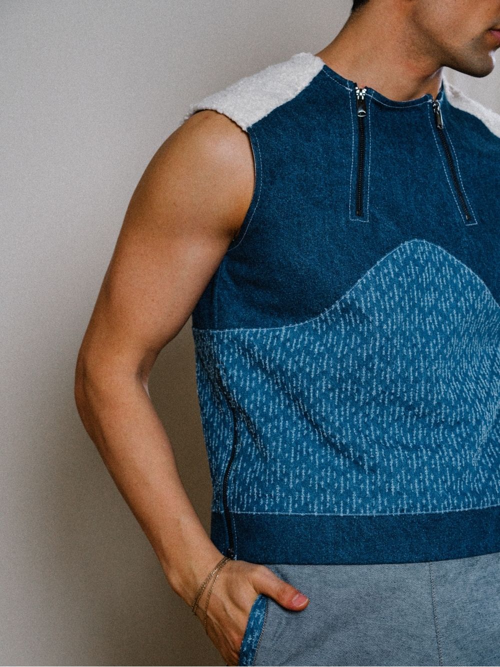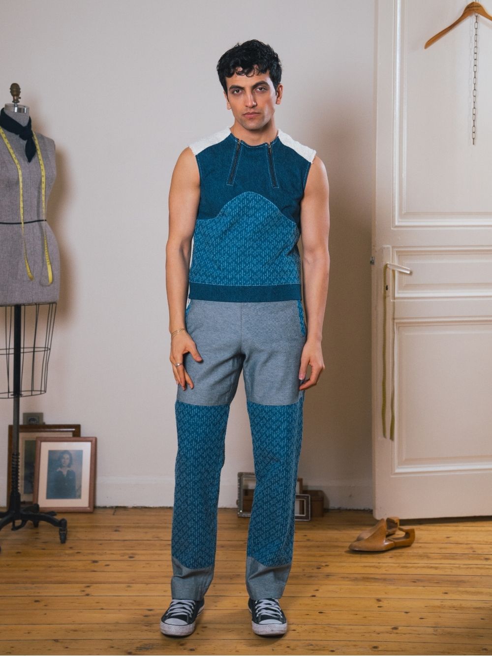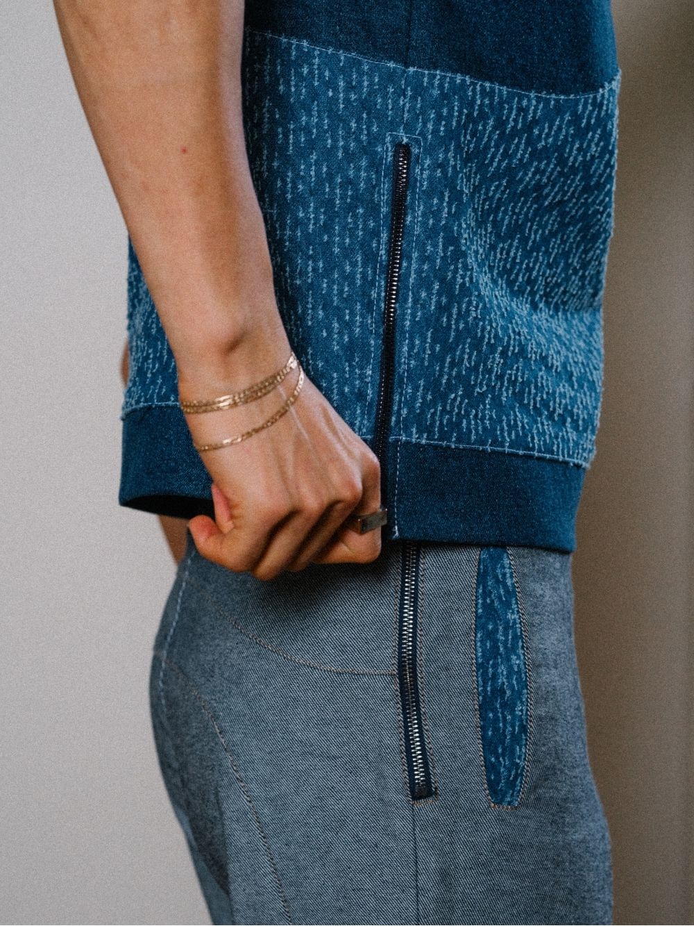 These unisex trousers feature a bold denim combo, with the back of the denim used for a unique twist. Side zipper openings add an edgy touch, making them a standout piece for any wardrobe.
