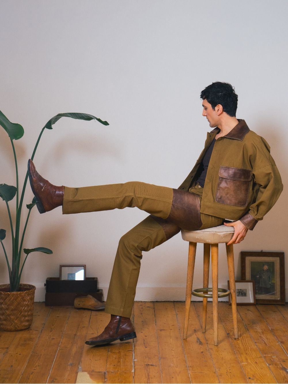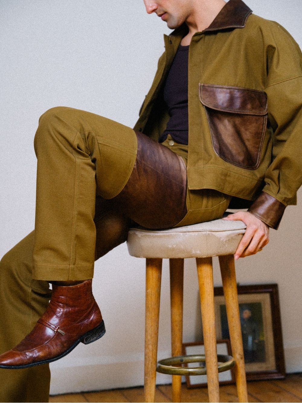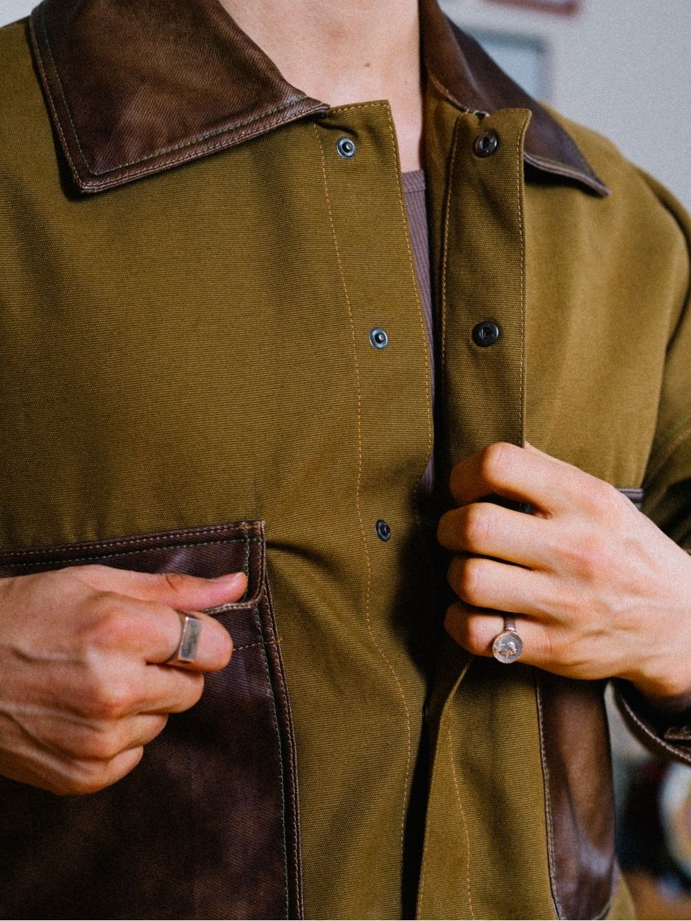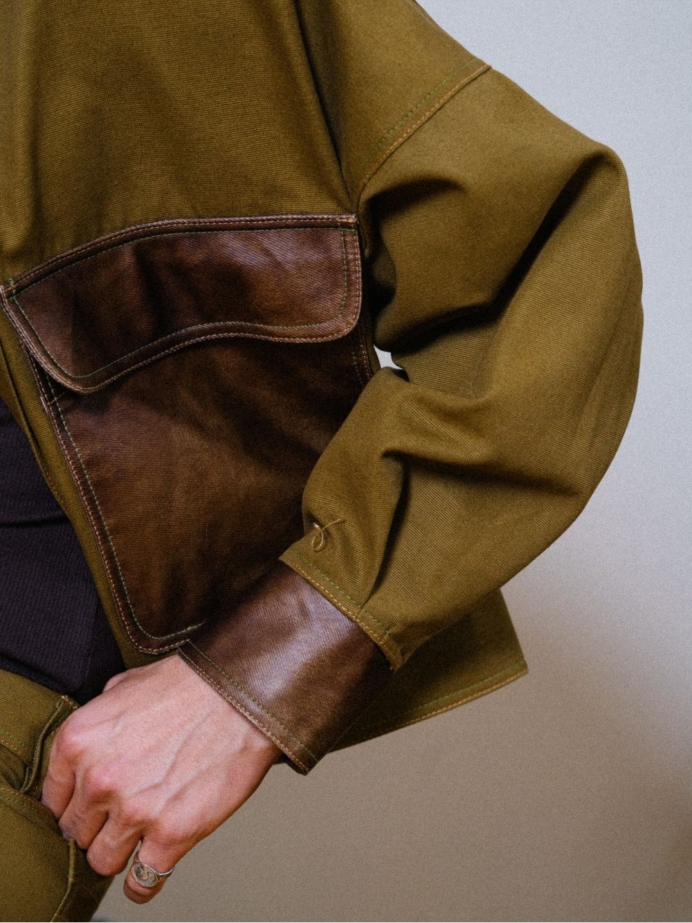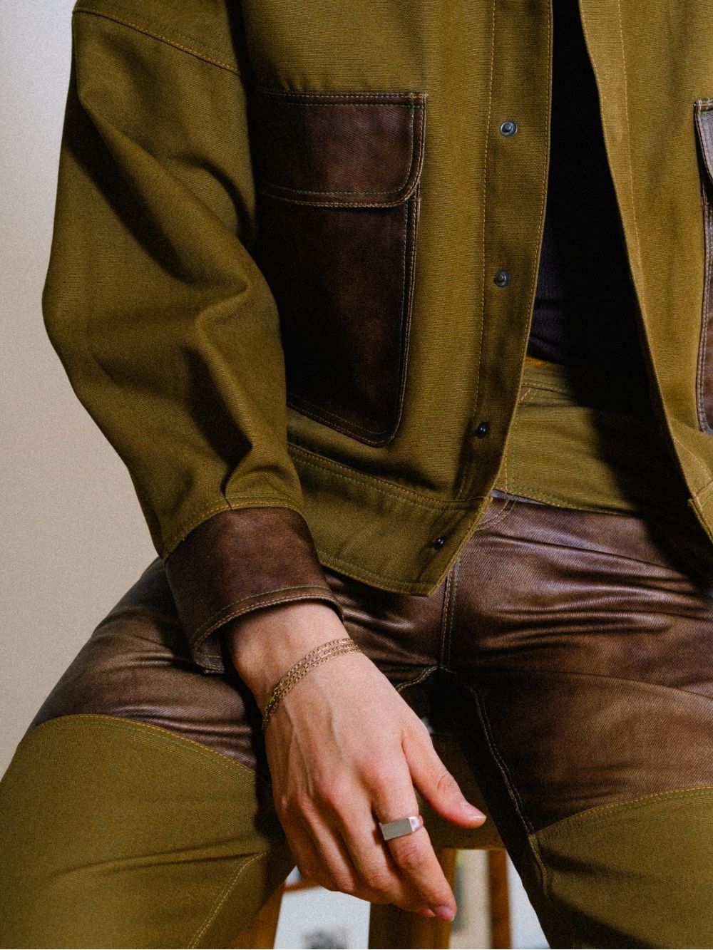Cropped at the waist for a bold silhouette. Golden olive canvas & coated brown denim combo adds contrast. One-size fit with hidden snap closures for a sleek finish. Versatile, structured, and built for movement.