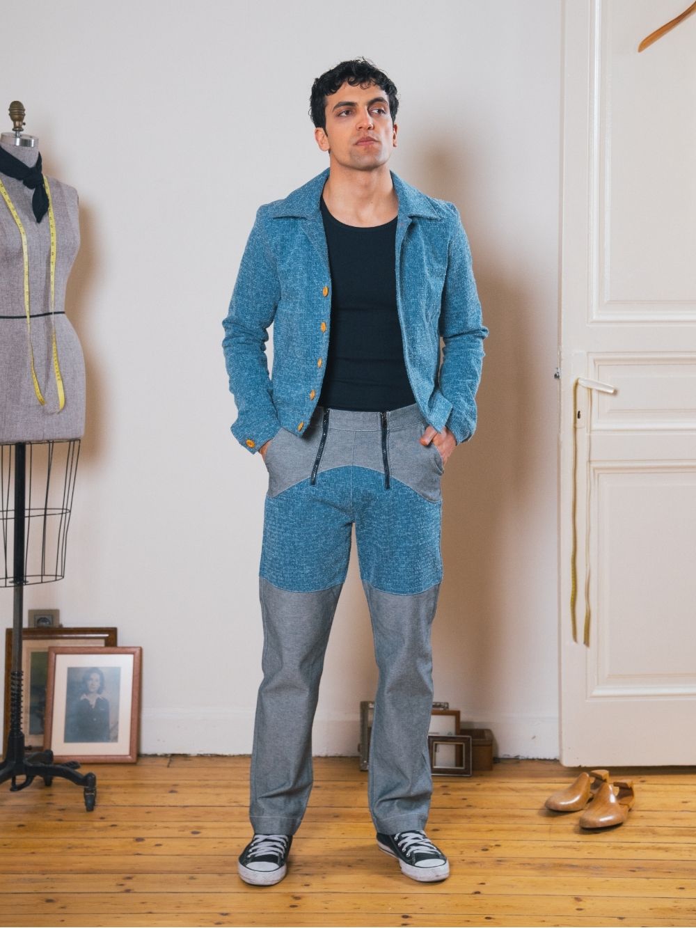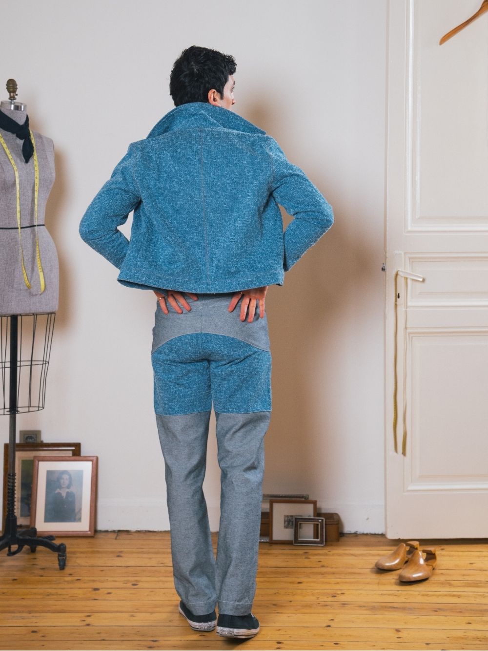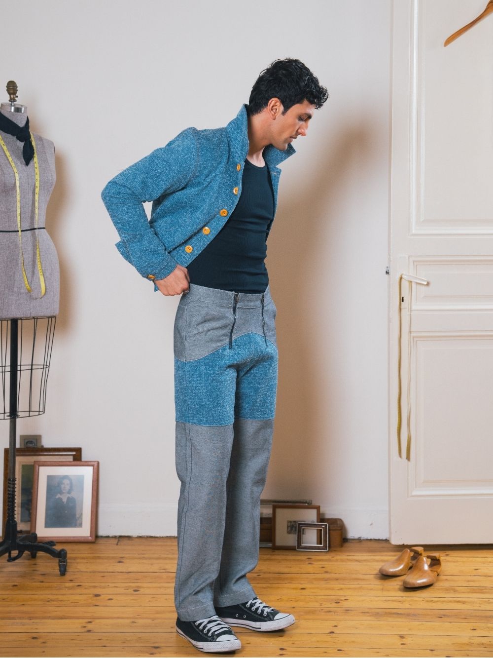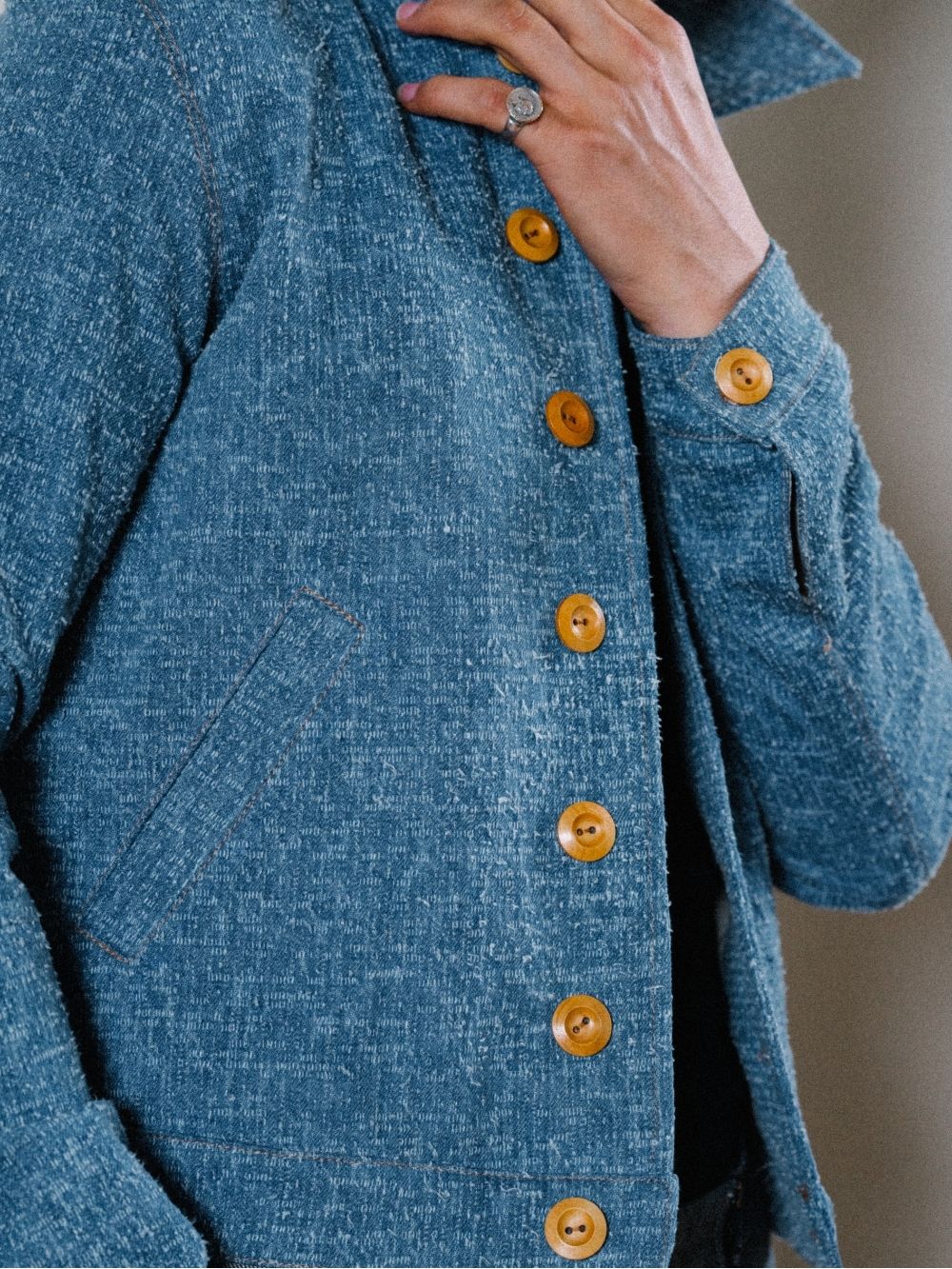 This cropped denim bomber jacket features wooden buttons for a unique touch and a comfortable cotton lining. A waist-hitting fit that blends classic style with modern edge.