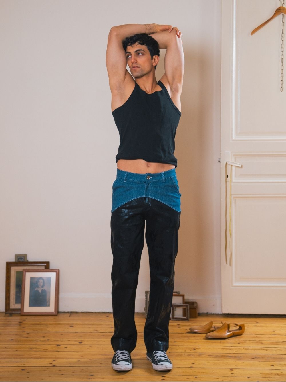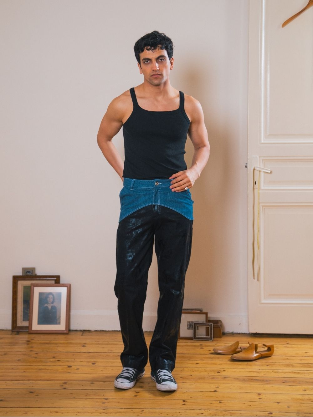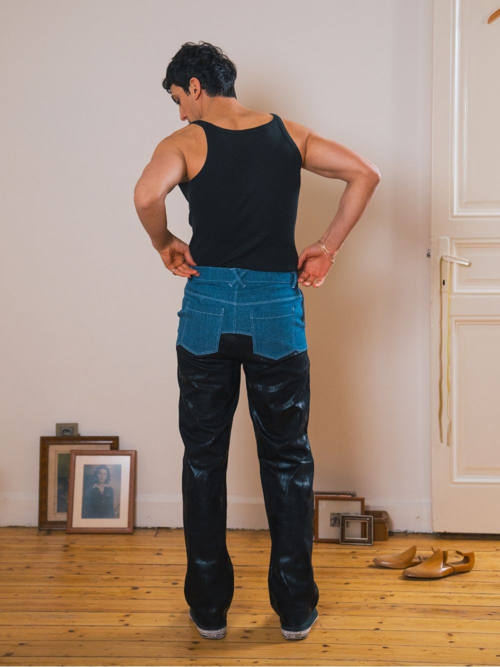 Drawing inspiration from the huntsman’s rugged style, these high-waisted jeans combine denim with coated camouflage black fabric for a bold, textured look. Crafted for a sharp, structured fit.
