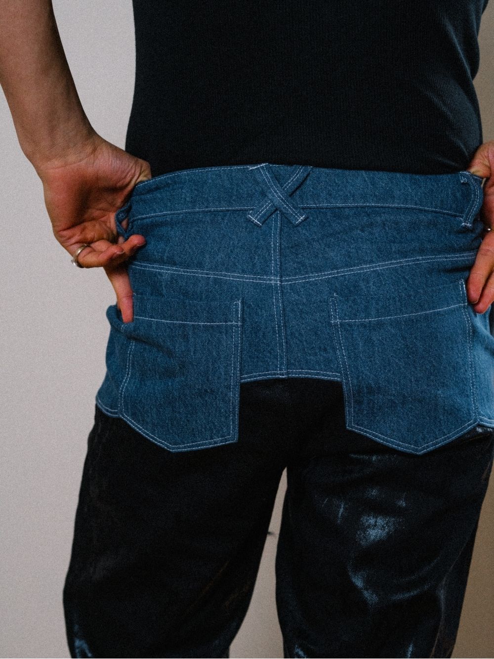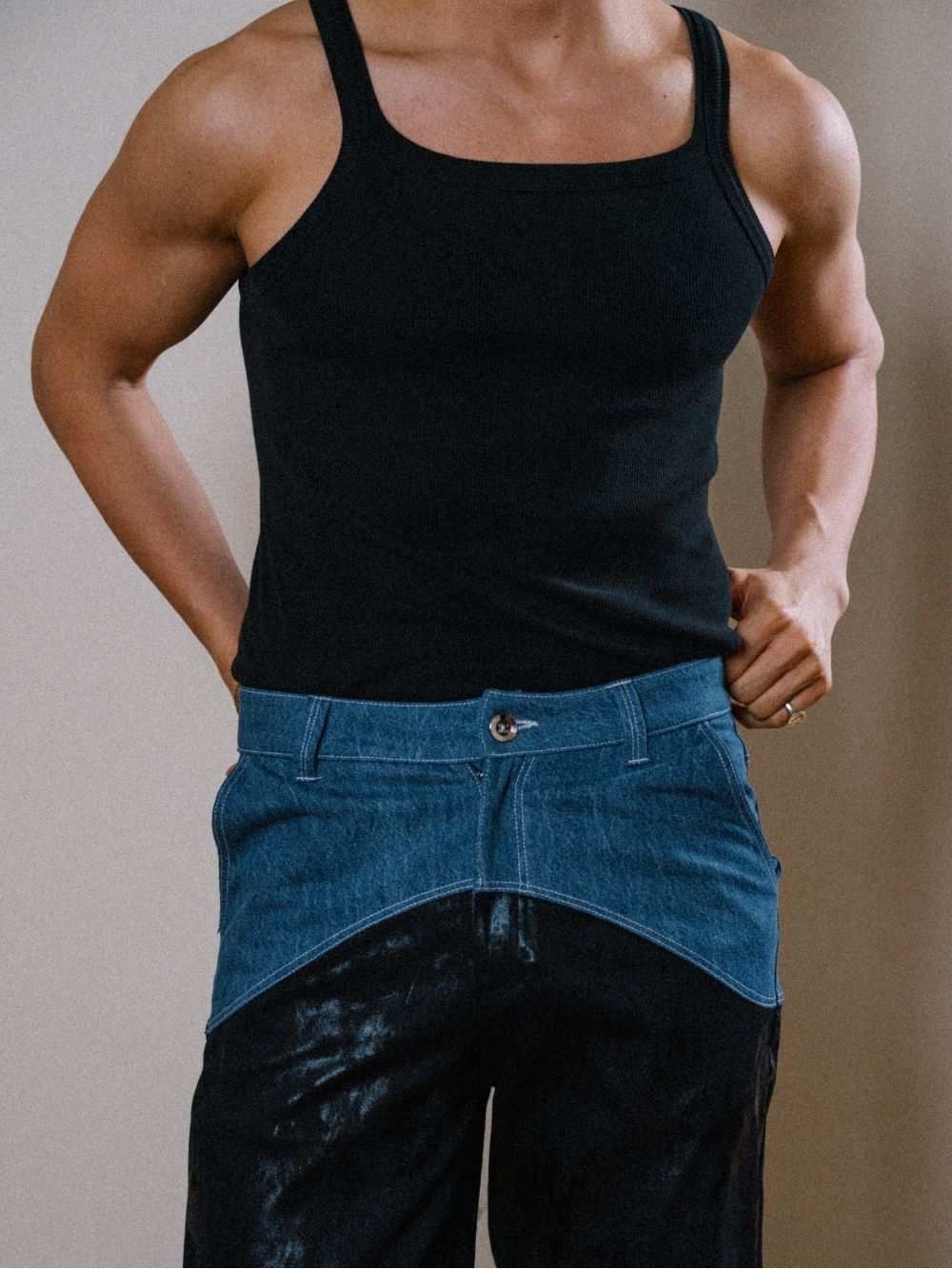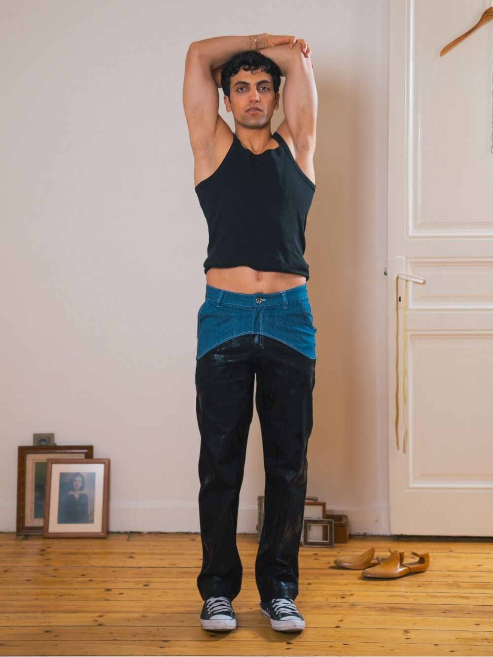 Drawing inspiration from the huntsman’s rugged style, these high-waisted jeans combine denim with coated camouflage black fabric for a bold, textured look. Crafted for a sharp, structured fit.