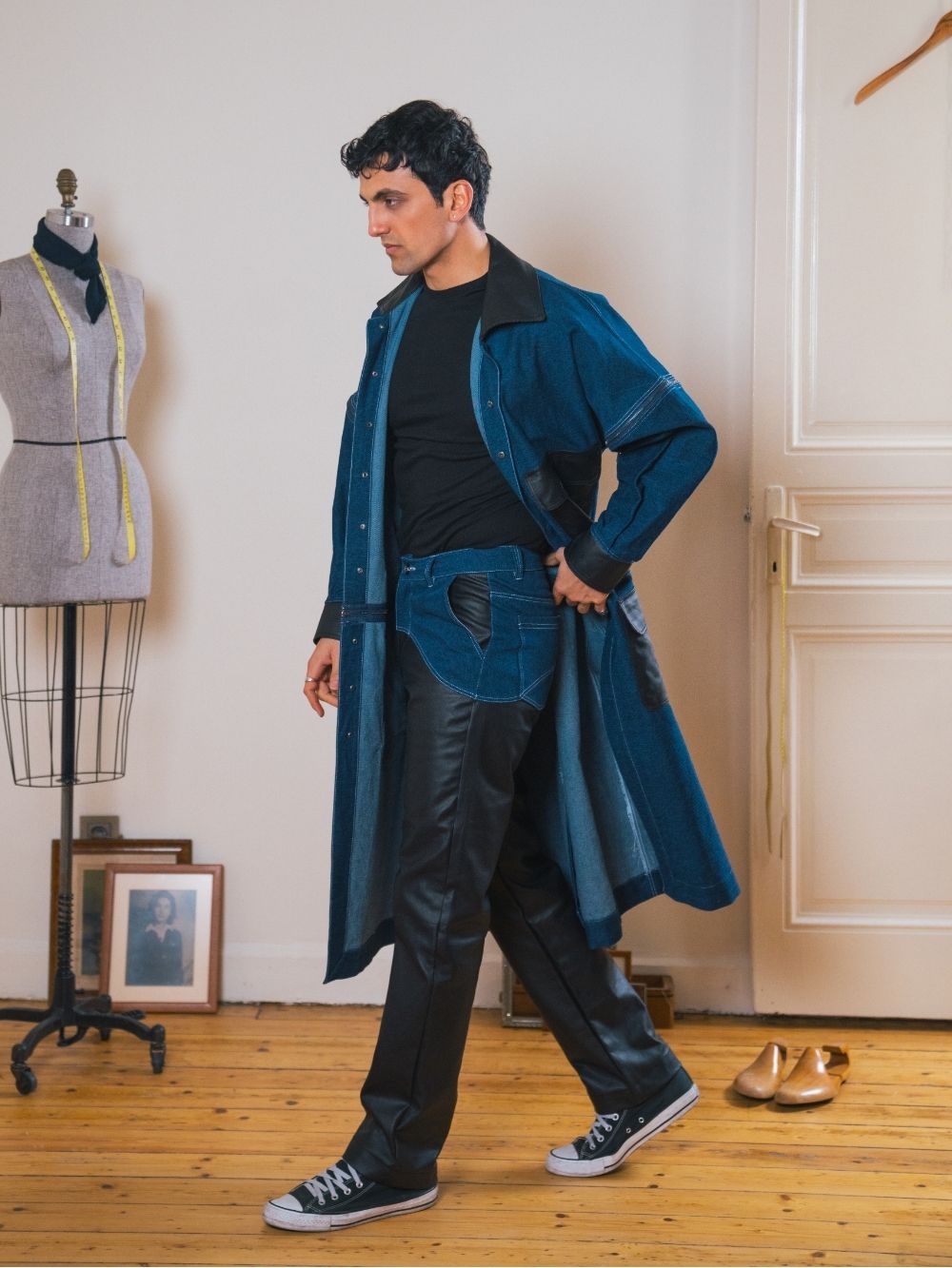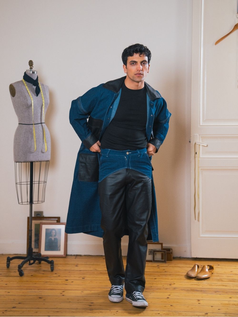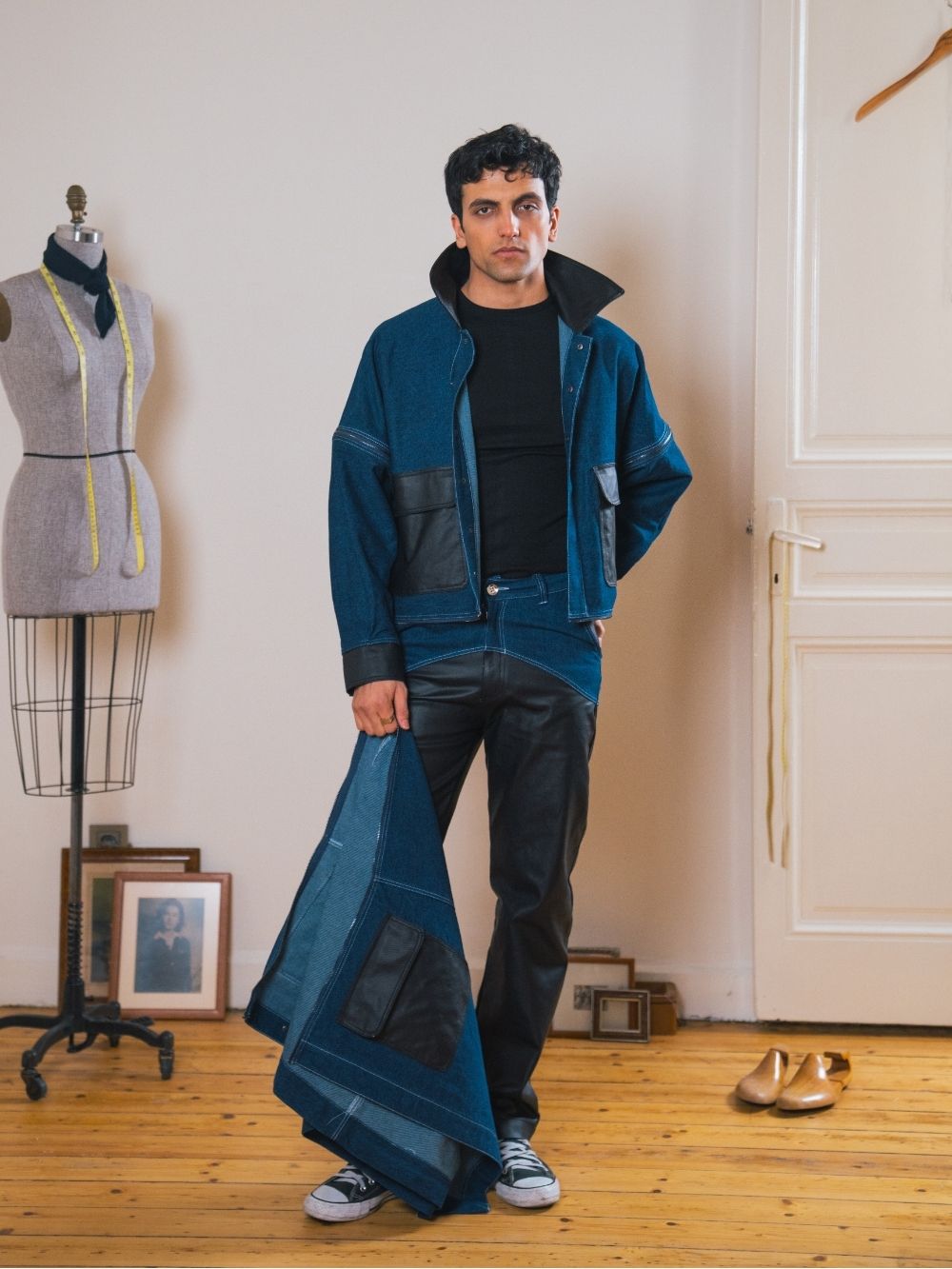 Drawing inspiration from the huntsman’s rugged style, these high-waisted jeans combine denim with coated black fabric for a bold, textured look. Crafted for a sharp, structured fit.