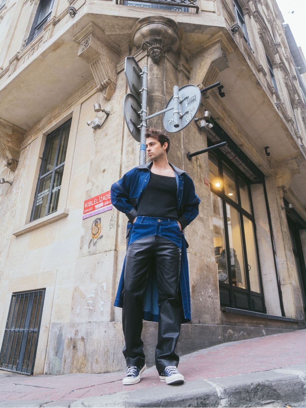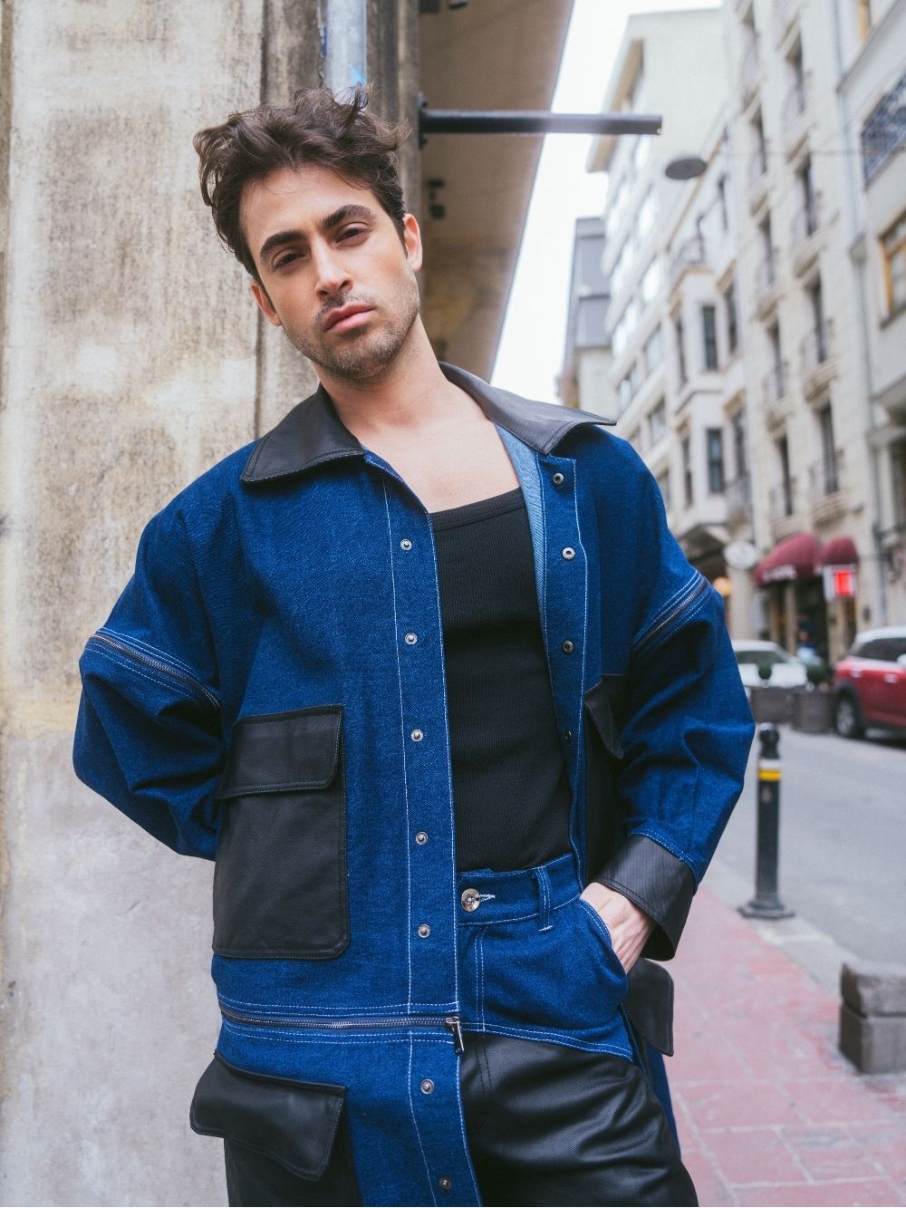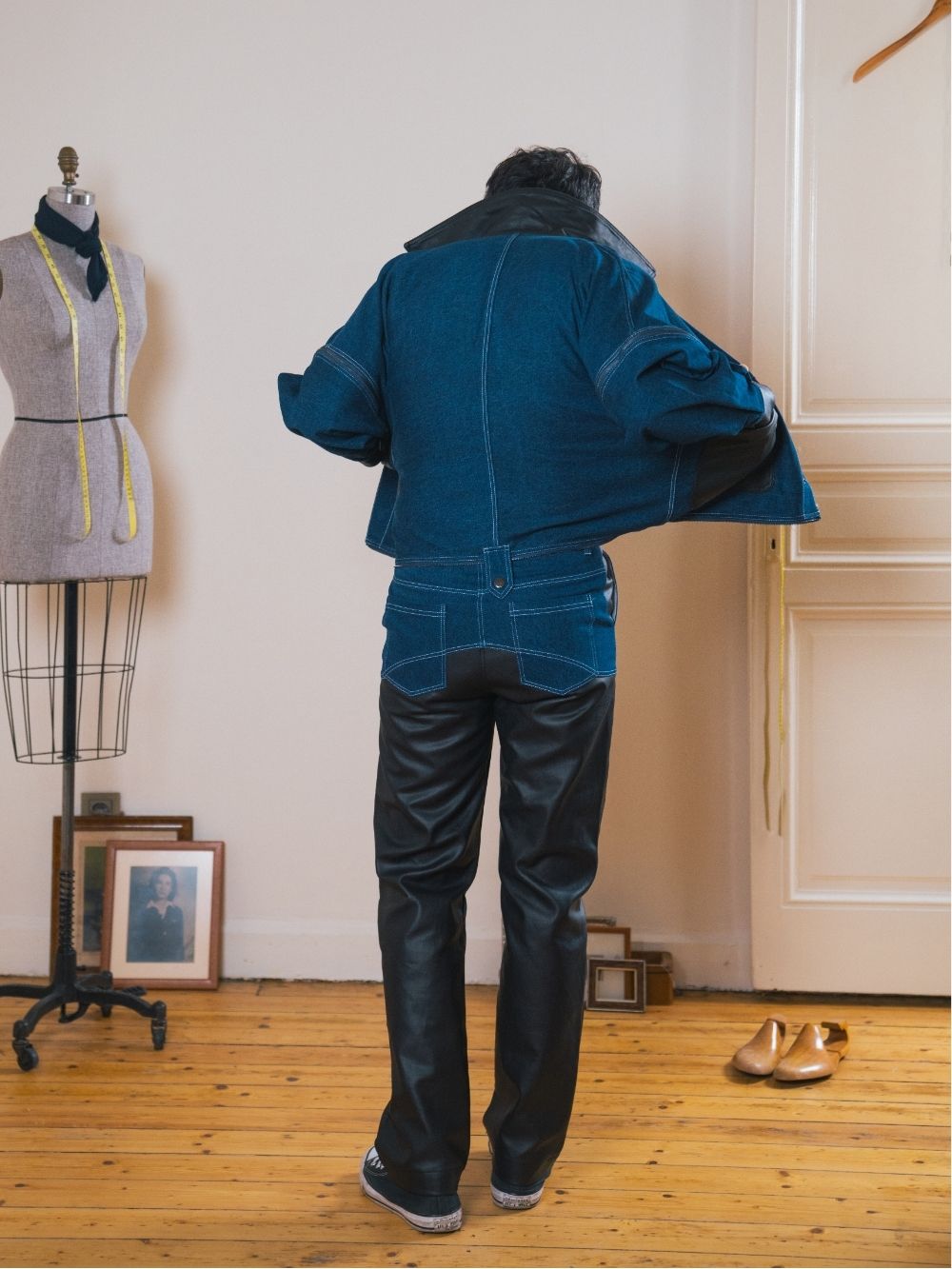 Drawing inspiration from the huntsman’s rugged style, these high-waisted jeans combine denim with coated black fabric for a bold, textured look. Crafted for a sharp, structured fit.