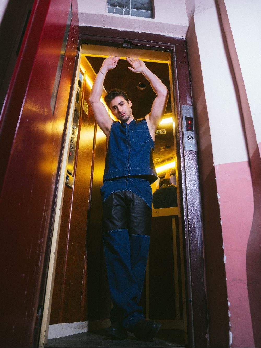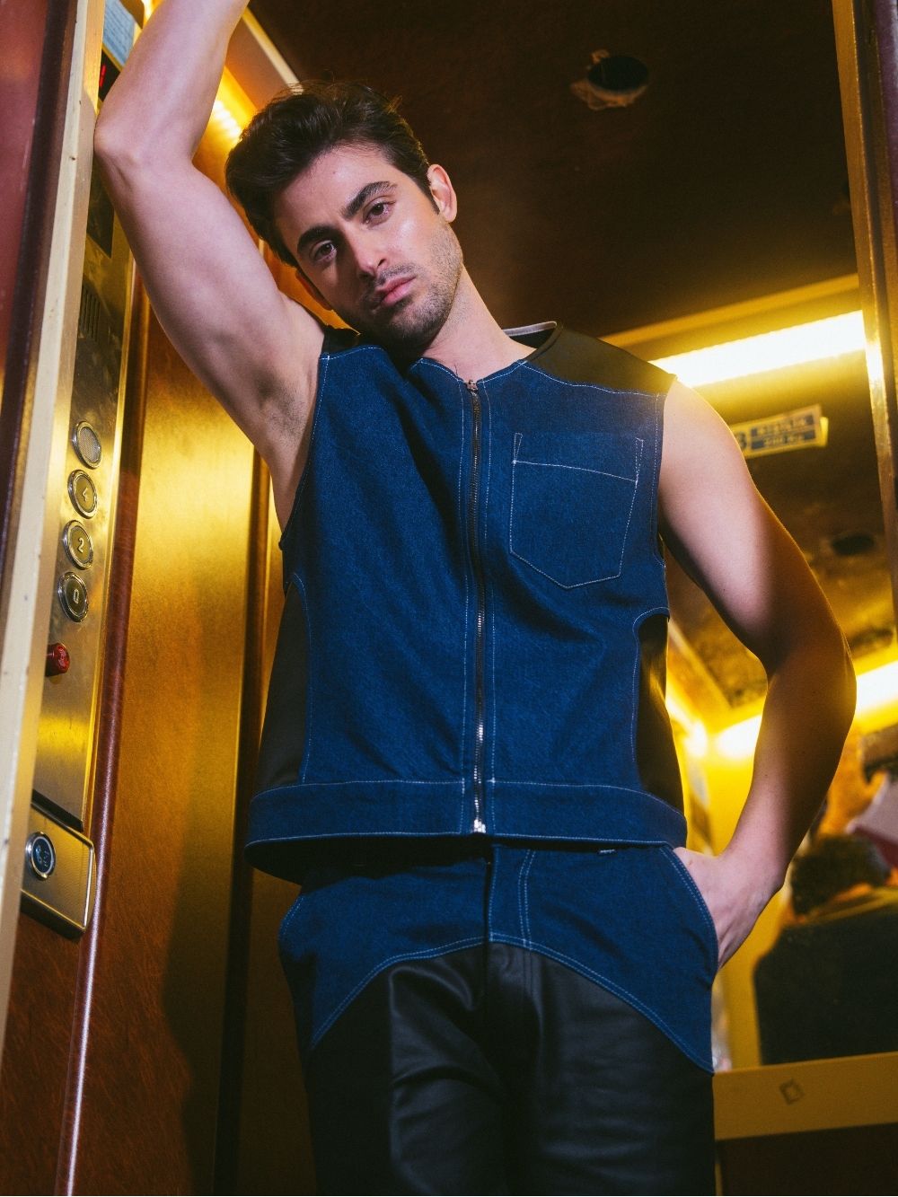 A cropped, waist-hitting vest inspired by the huntsman’s rugged style. Featuring a front zipper opening and a coated denim combo for a bold, structured look. Perfect for layering or as a statement piece.