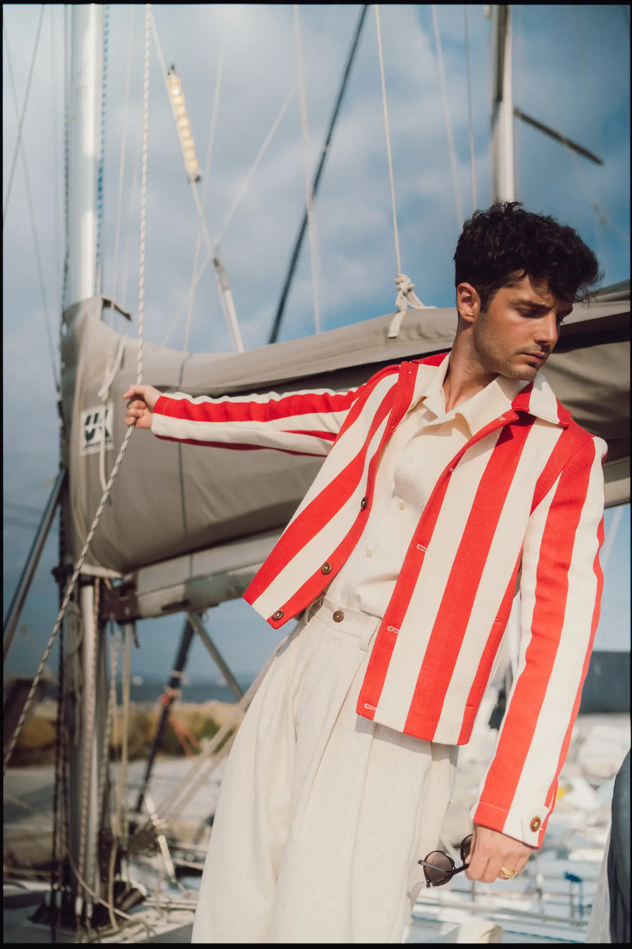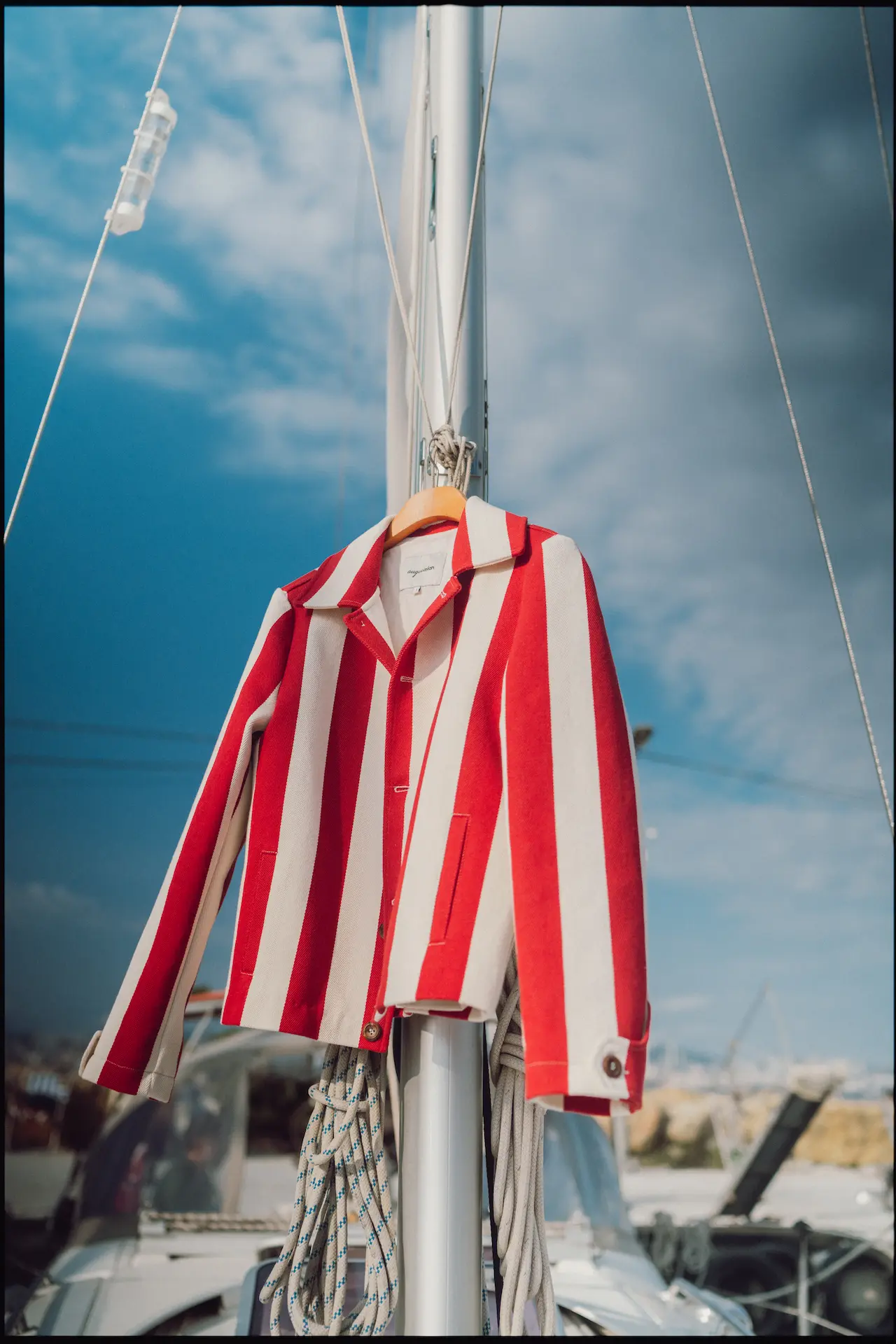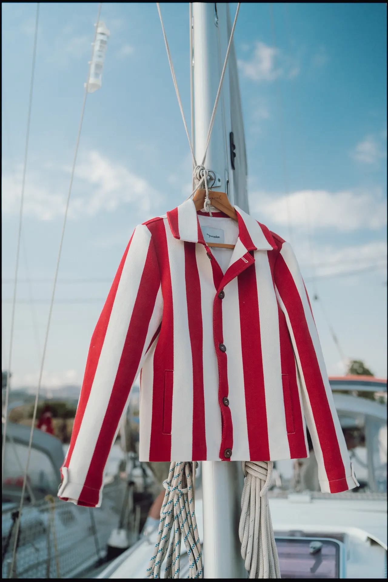 “A fiery reinterpretation of the classic. Bold red and cream stripes meet a sharp, cropped silhouette — a jacket that captures the heat of summer afternoons and the spirit of seaside adventures. Finished with natural Turkish olive wooden buttons for a warm, tactile contrast.”