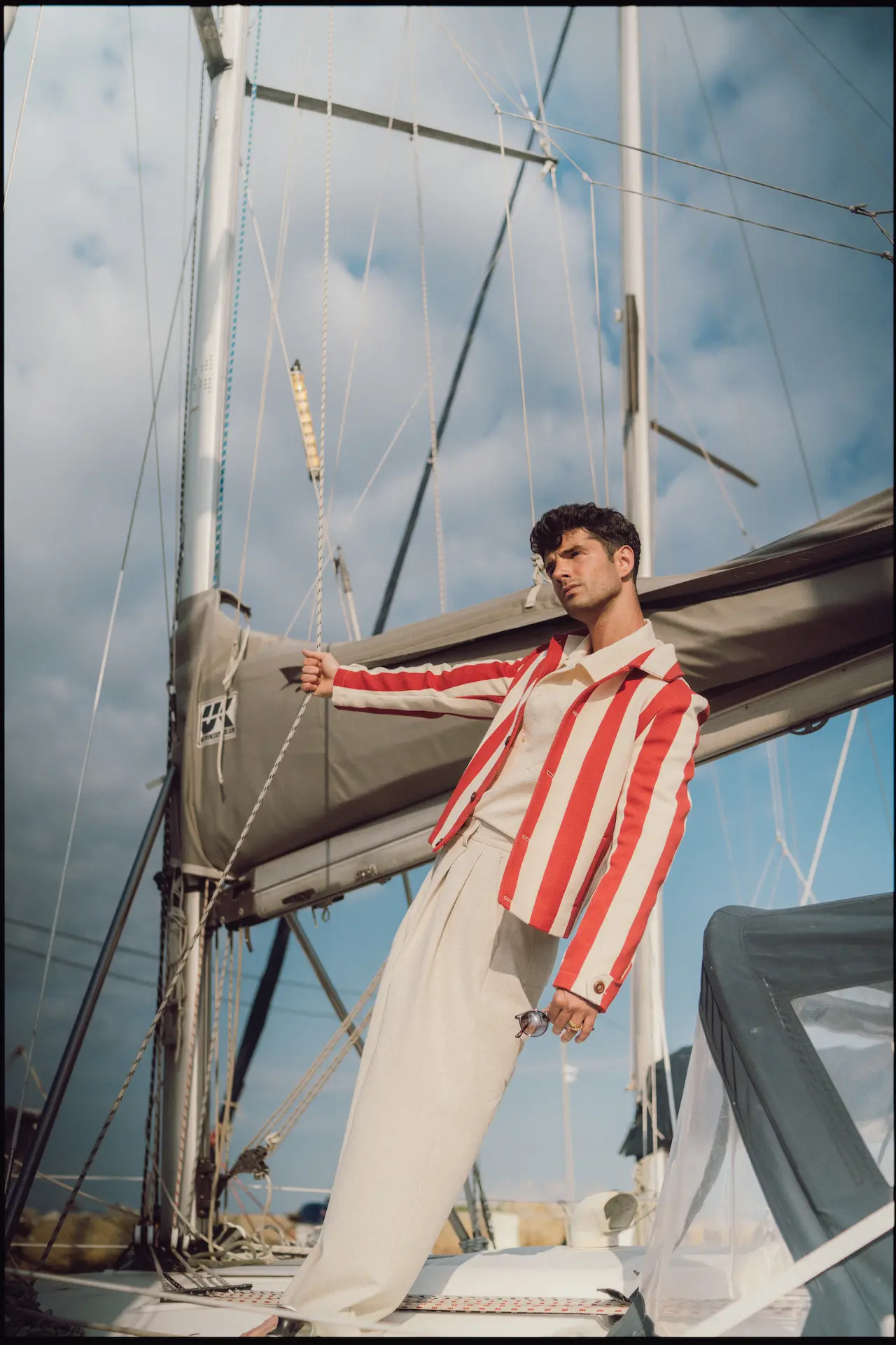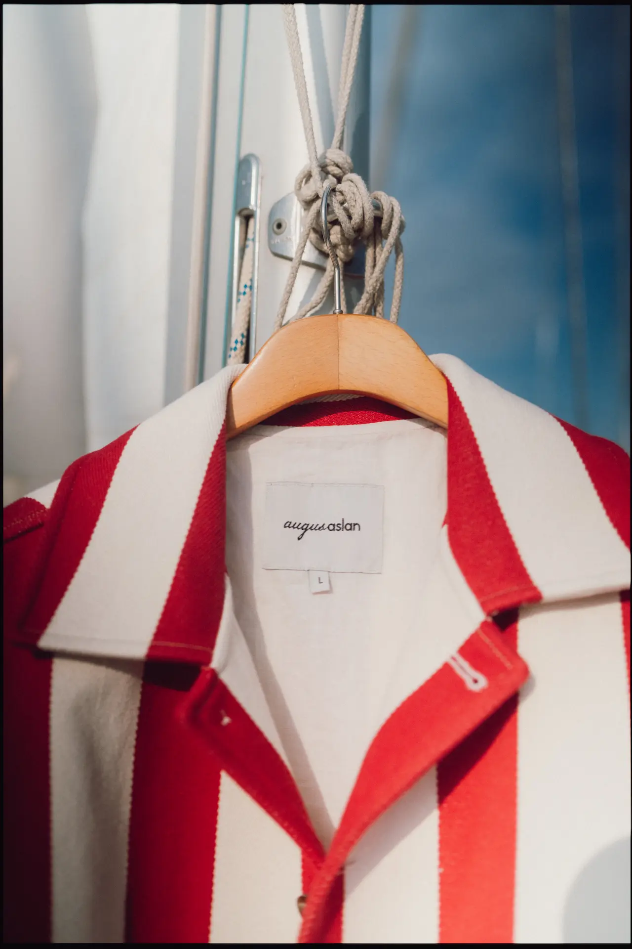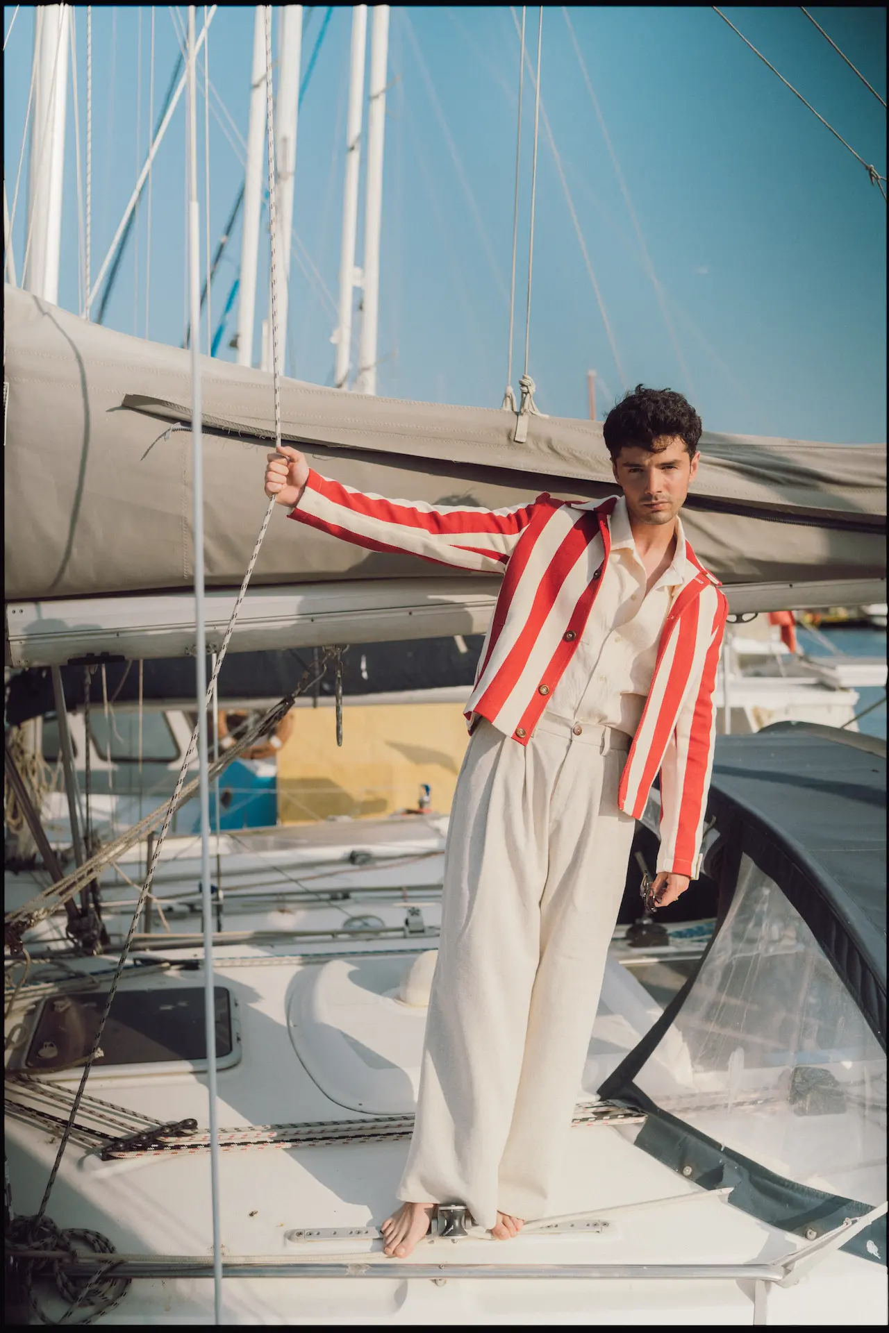 “A fiery reinterpretation of the classic. Bold red and cream stripes meet a sharp, cropped silhouette — a jacket that captures the heat of summer afternoons and the spirit of seaside adventures. Finished with natural Turkish olive wooden buttons for a warm, tactile contrast.”