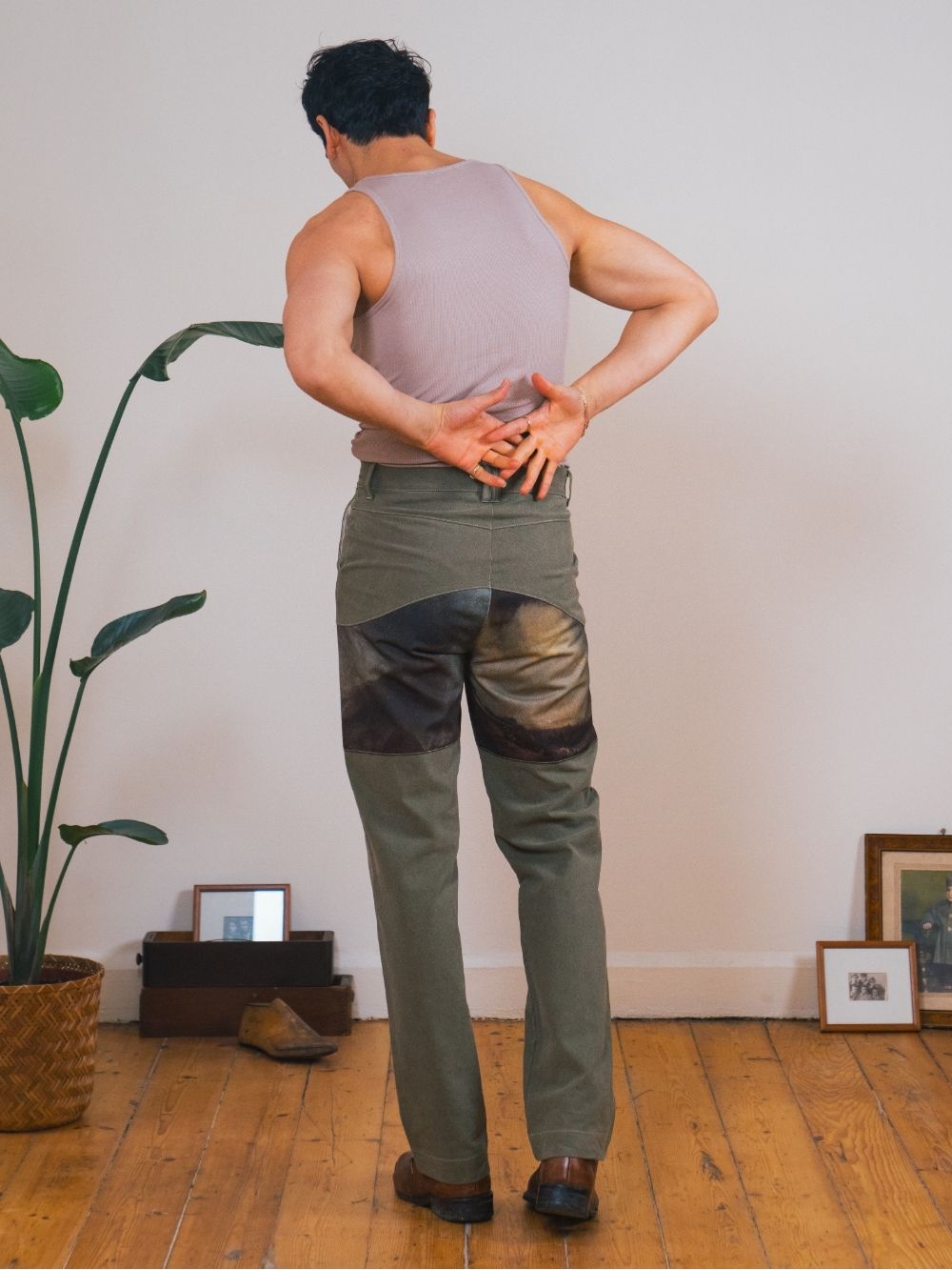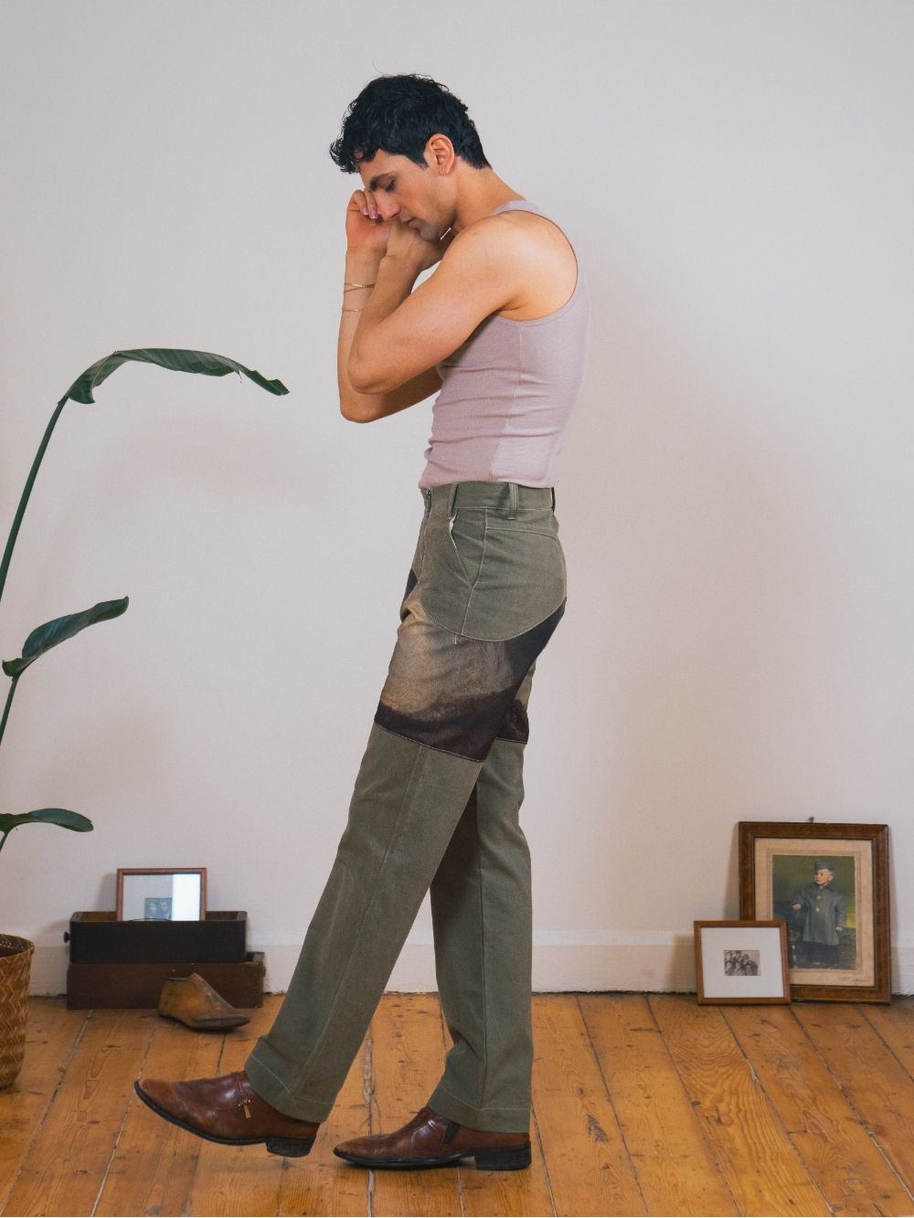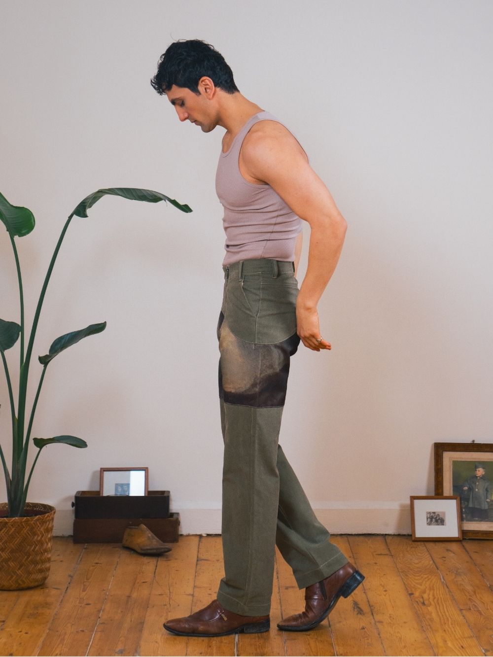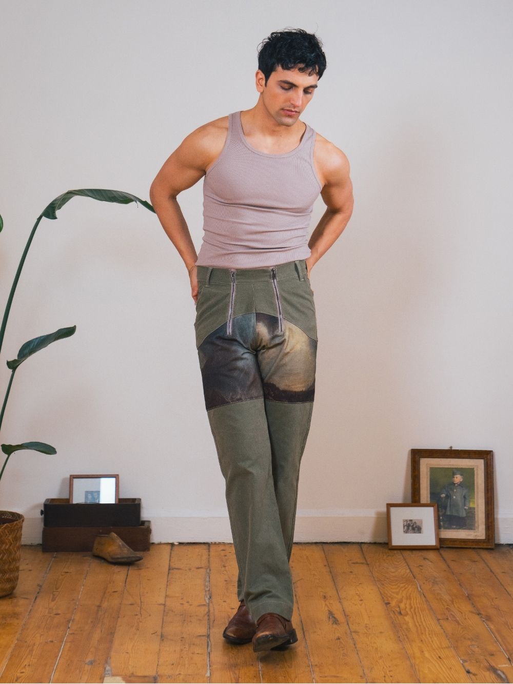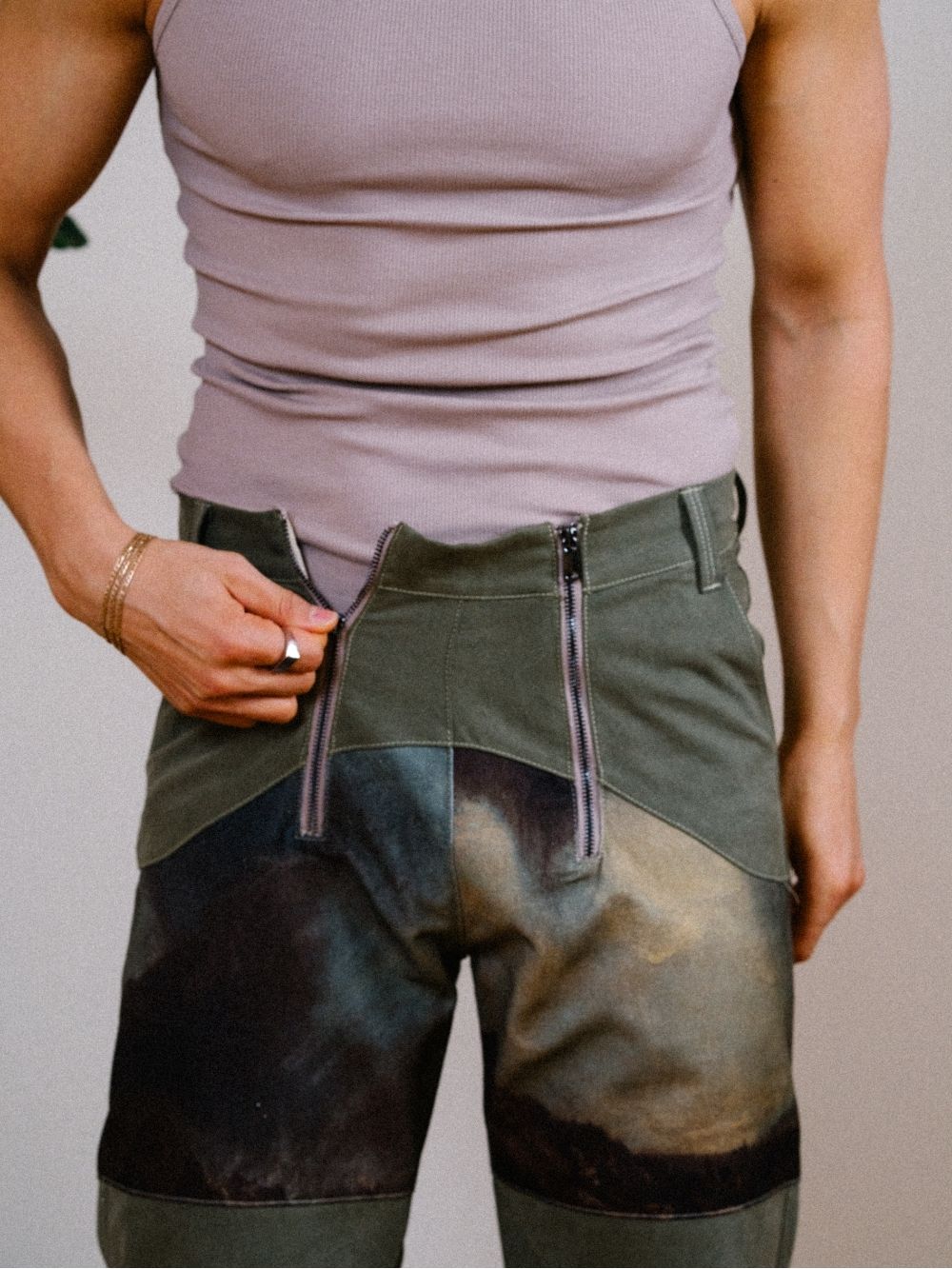 These high-waisted trousers feature a bold combination of washed green canvas. With dual zippers for added functionality, they offer a rugged yet stylish fit inspired by the huntsman’s classic style.