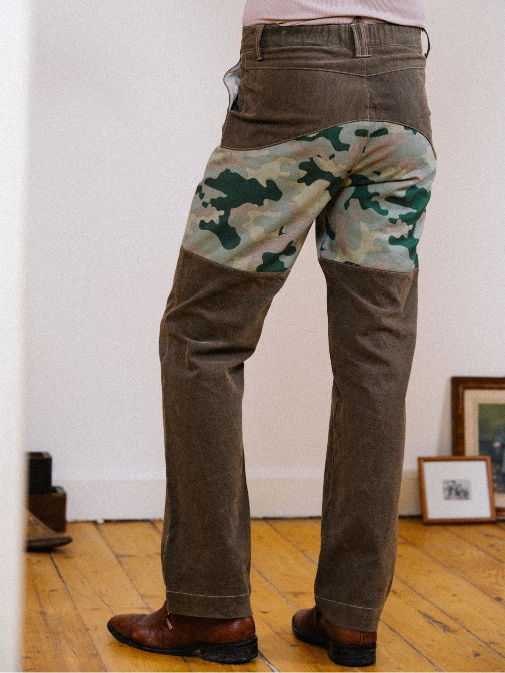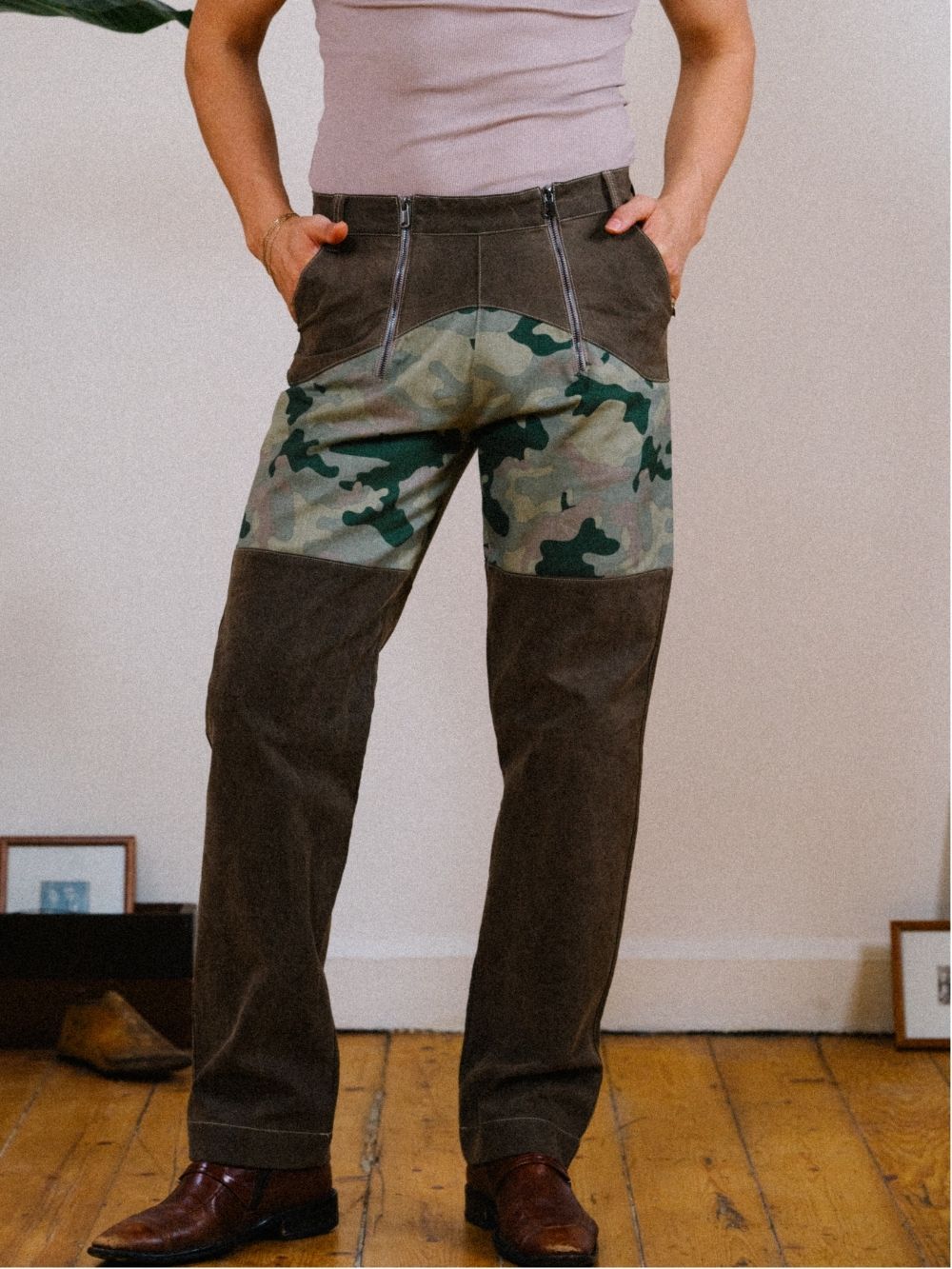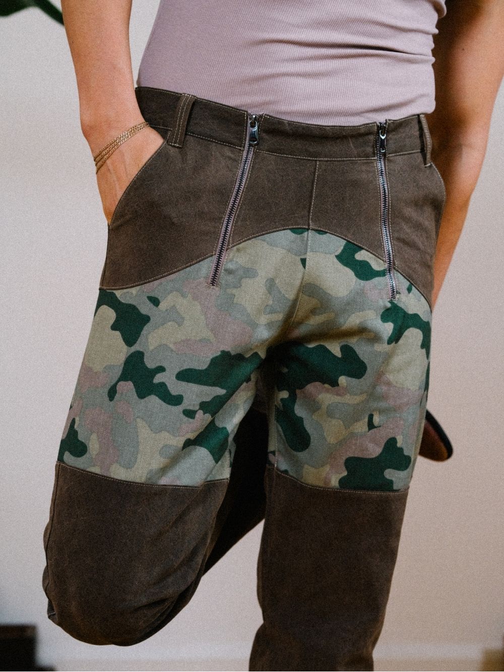 These high-waisted trousers feature a bold combination of washed brown canvas and camouflage fabric. With dual zippers for added functionality, they offer a rugged yet stylish fit inspired by the huntsman’s classic style.
