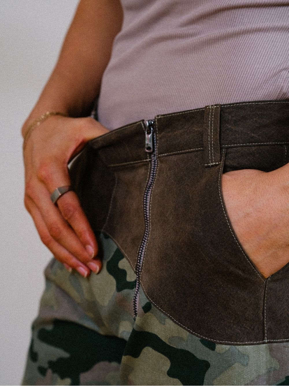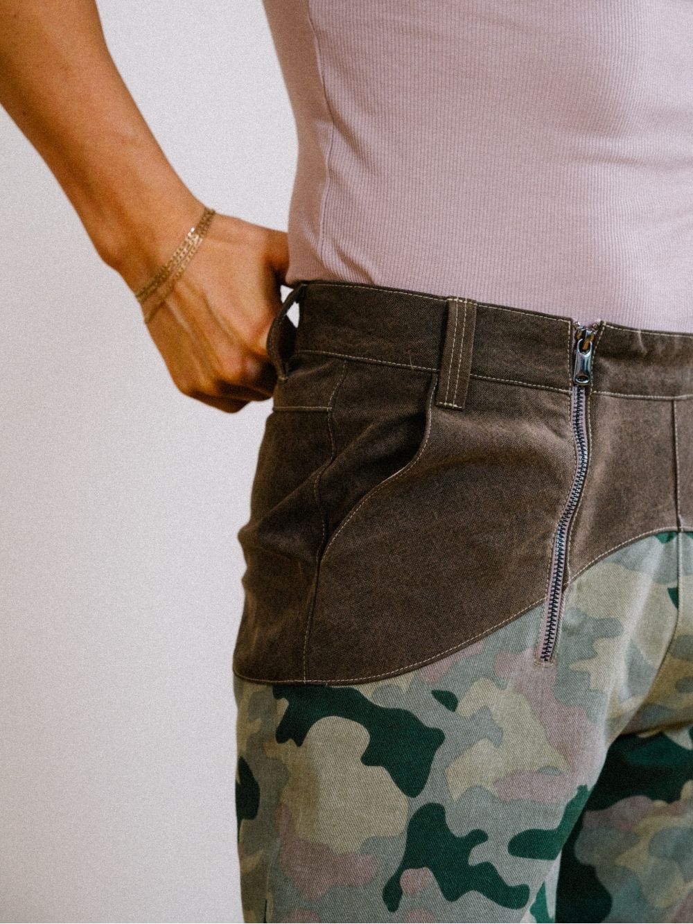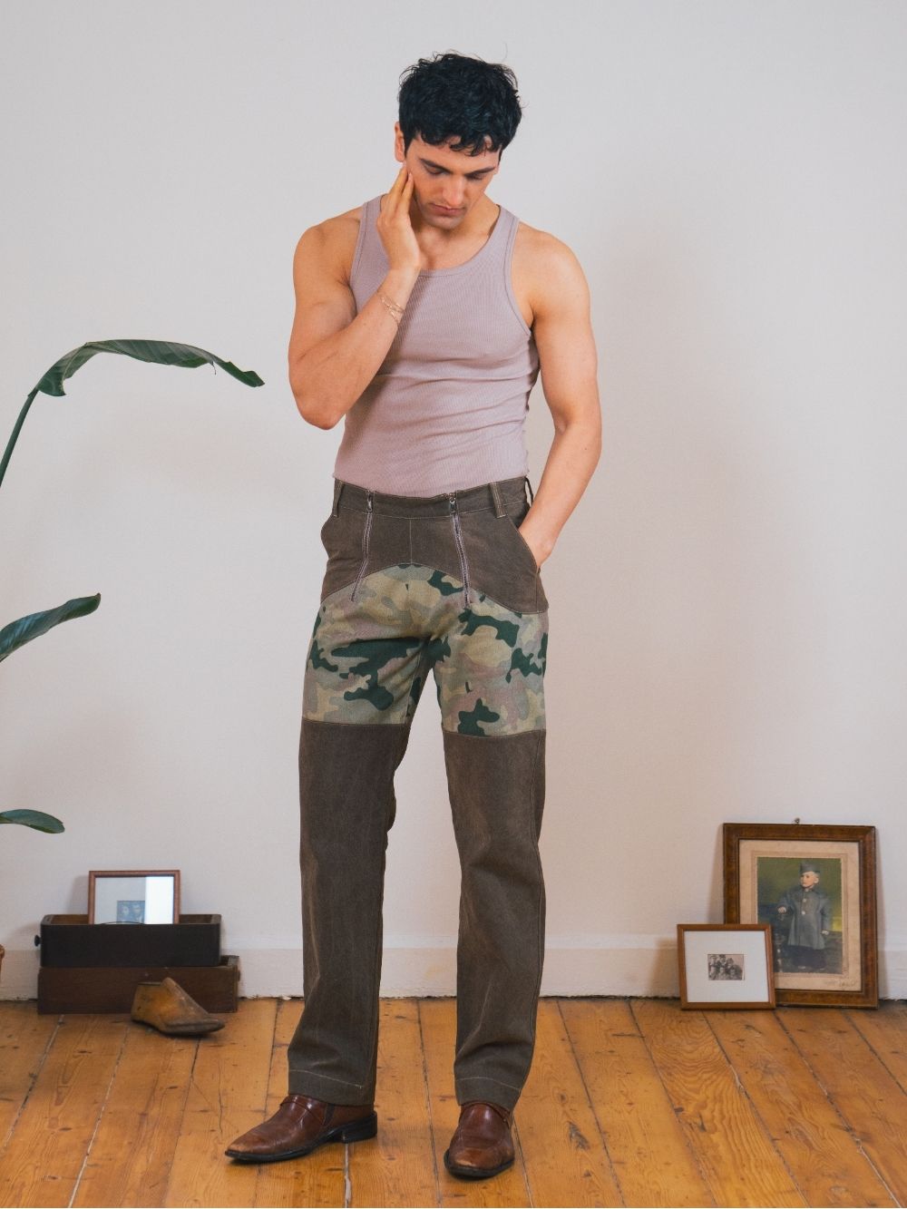 These high-waisted trousers feature a bold combination of washed brown canvas and camouflage fabric. With dual zippers for added functionality, they offer a rugged yet stylish fit inspired by the huntsman’s classic style.